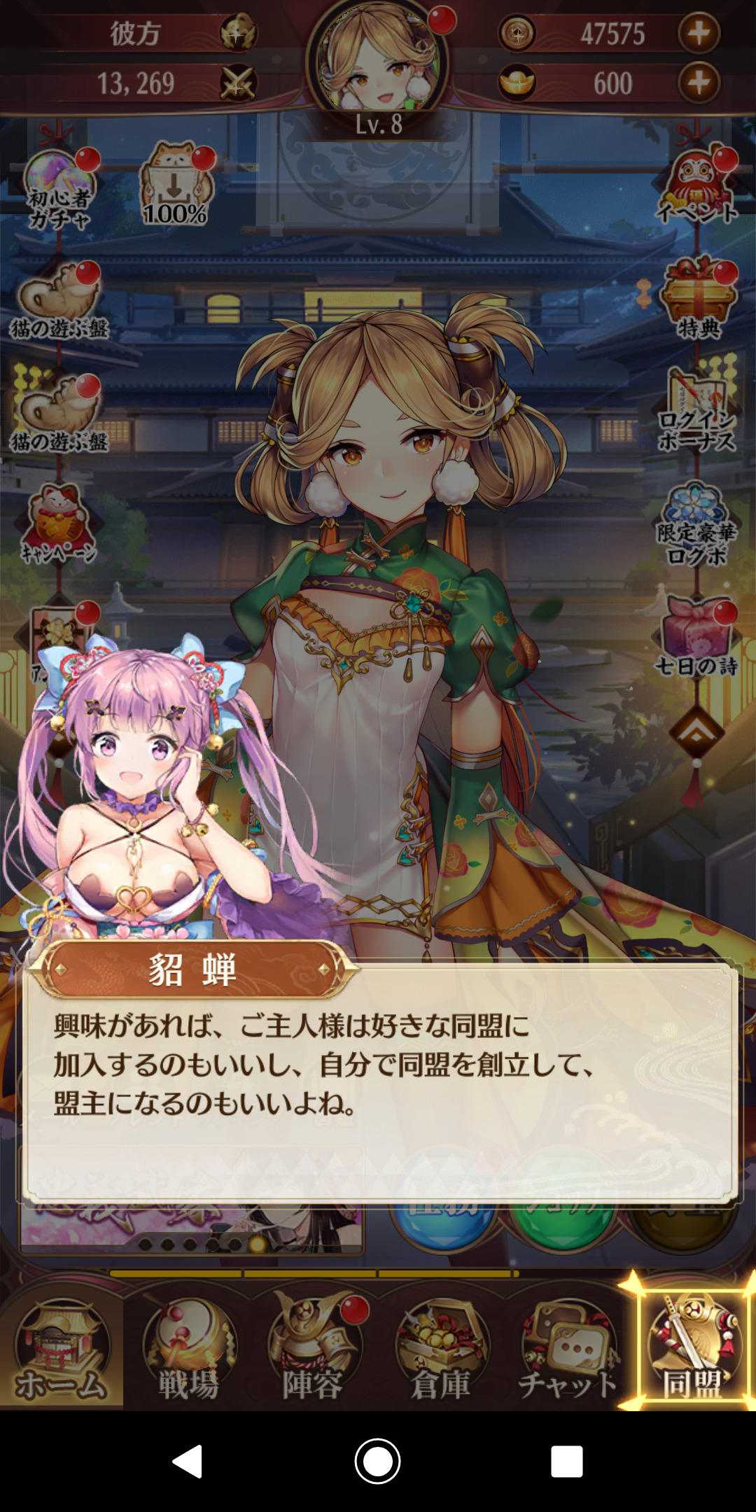 三国志の世界観の中で、美少女キャラを育成していく放置ゲームです。